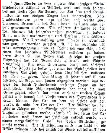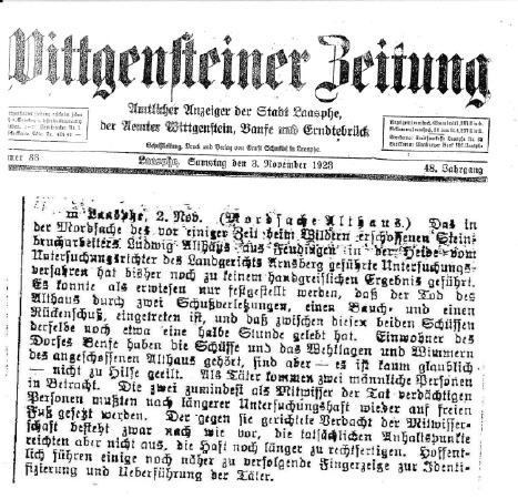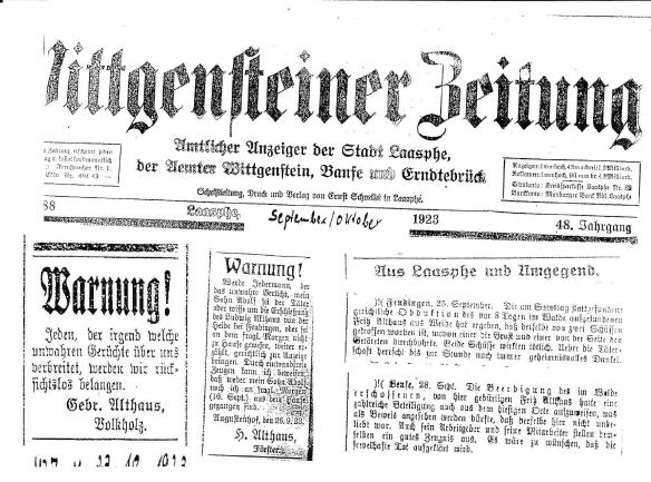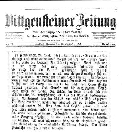 Die Presse berichtet am 21. September 1923 über den Leichenfund vom 20. September. Am 22. September erscheint ein weiterer Artikel, ebenso am 10. Oktober 1923, am 03. November 1923 und am 05. März 1924 - die Presse berichtet fortlaufend. Doch bis zum Schluss bleibt das Geschehene rätselhaft. Nicht nur über den Namen des Opfers herrscht anfangs Verwirrung. Zunächst ist von Fritz Althaus die Rede. Später jedoch wird klar, dass es sich um den aus der Benfe stammenden und nun in Weide verheirateten Ludwig Althaus (* 1875) geht. Er war Ehemann von Karoline Bernshausen und Familienvater von 8 Kindern (ein neuntes Kind wurde erst nach seinem Tod geboren).
